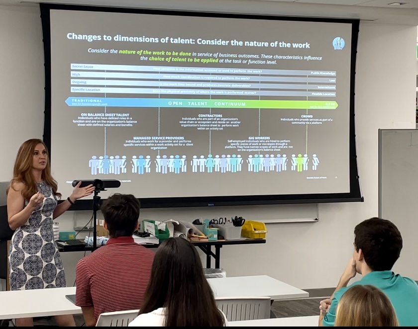 Courtney Porter showed College of Business students an “Open Talent Continuum” that included “traditional” work on the left and “open” work on the right. From left to right, the continuum featured on-balance-sheet employees, managed service providers, contractors, gig workers and crowdsourced workers.