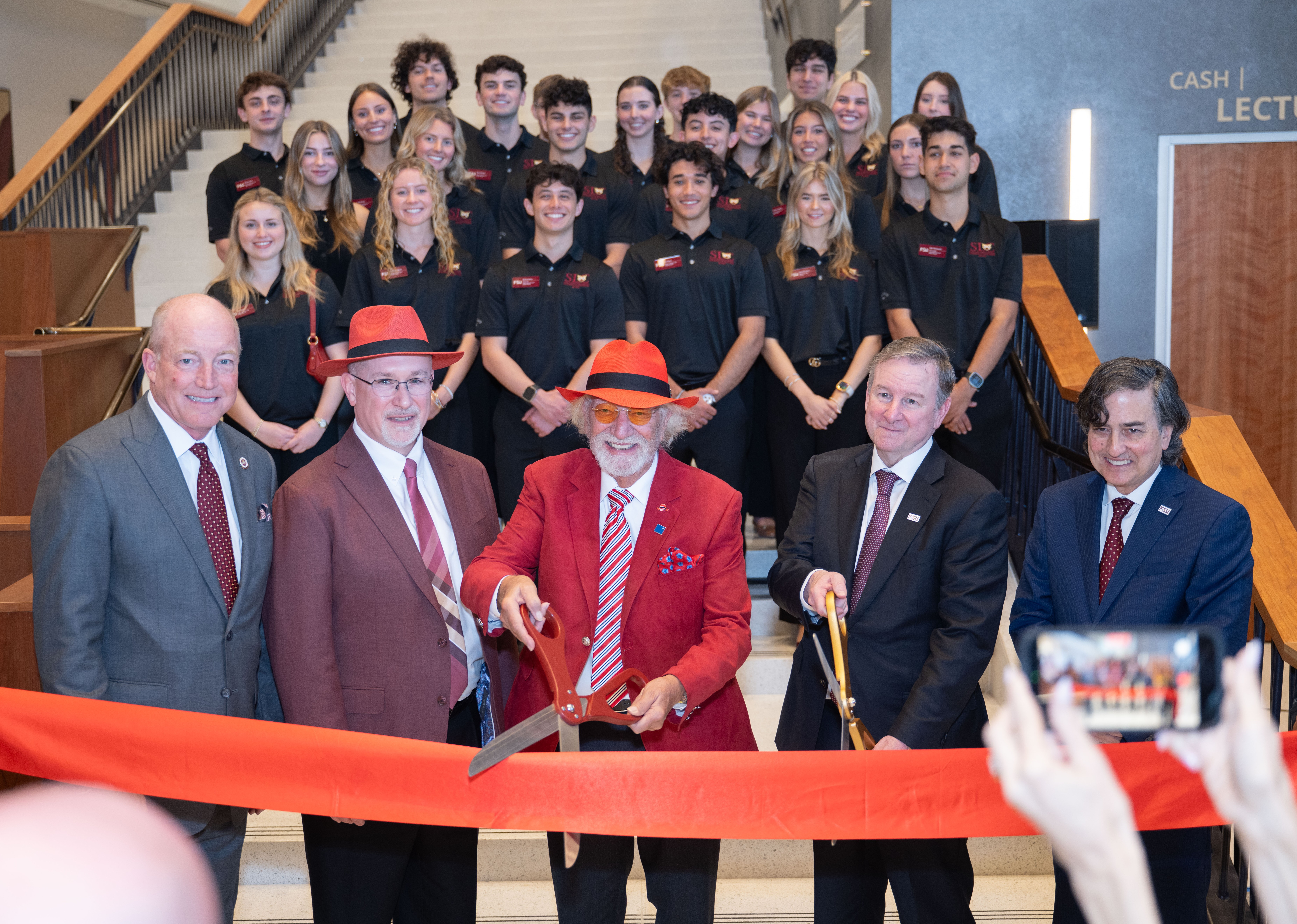 With the Business Student Leadership Council behind him, Dr. Herbert Wertheim, center, is joined by, from left, FSU Board of Trustees Chair Peter Collins, Wertheim College of Business Dean Michael Hartline, FSU President Richard McCullough and Provost James Clark in marking the grand opening of the Herbert Wertheim Center for Business Excellence.