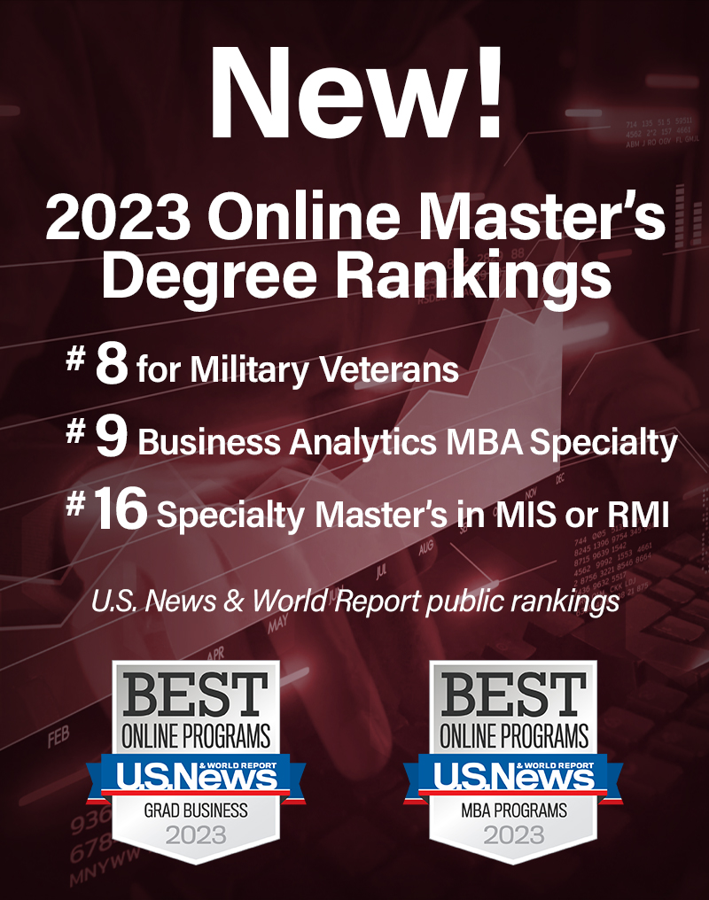 • No. 16 public ranking, No. 21 overall among best online graduate business degrees, specifically the online Management Information Systems (MS-MIS) and the online master's degree in the Dr. William T. Hold/The National Alliance Program in Risk Management and Insurance (MS-RMI).