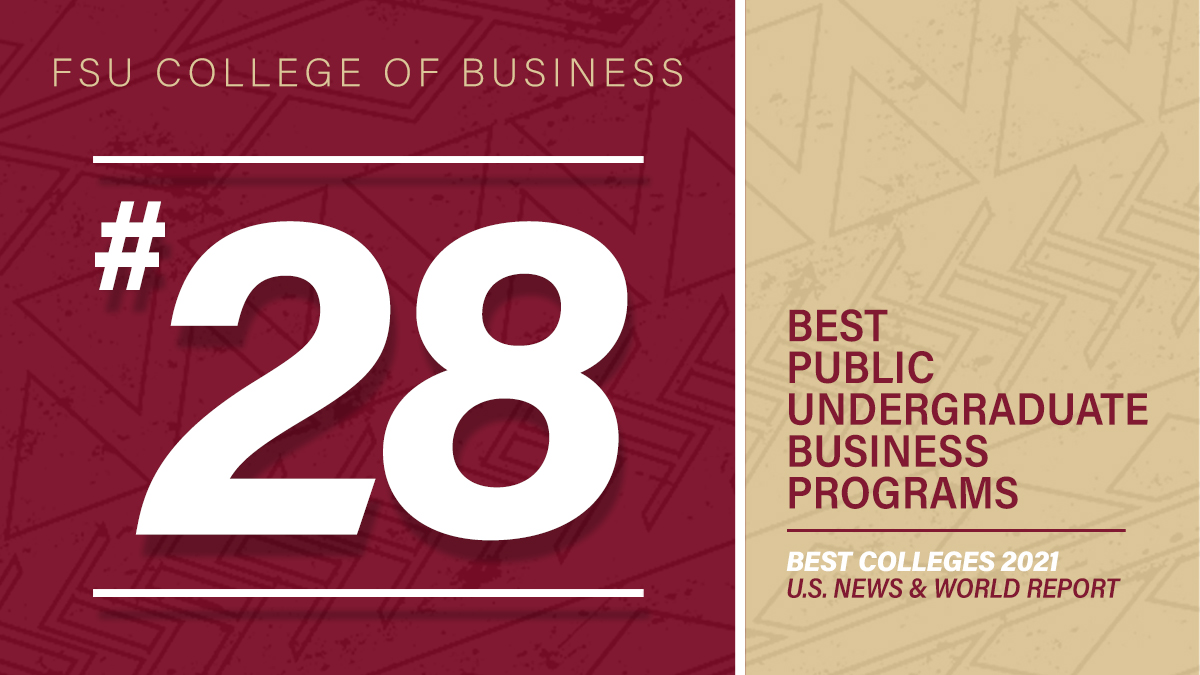 The Florida State University College of Business moved closer to its goal of achieving a Top 25 ranking among the nation’s public business schools. The college’s undergraduate program jumped to No. 28 from last year’s ranking of No. 31 among public universities in the U.S. News & World Report’s “Best Colleges Guide 2021” rankings released Sept. 14. Among all universities, the college rose six spots to No. 44 from No. 50.